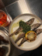 Grilled sardines - (served with) salsa verde - charred lemon (GF).